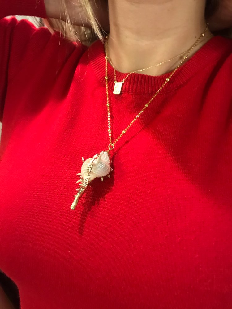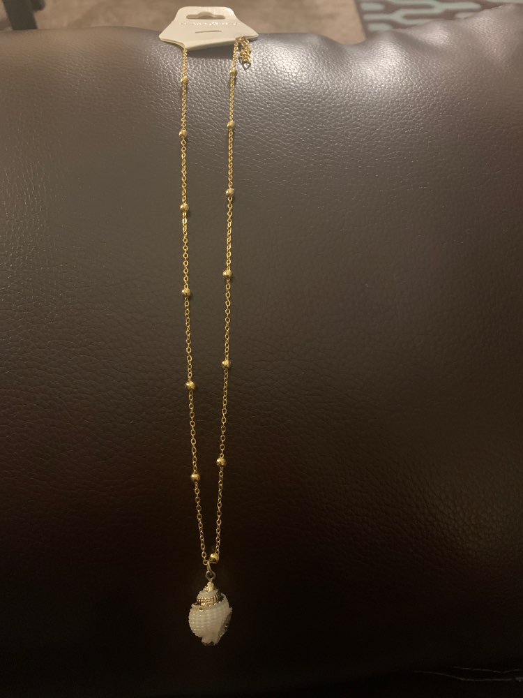 So beautiful! Ordered on: 11-11-2019 Received on:12-01-2019 Packaging: The package came in a secure bag that kept it perfectly intact, it was also wrapped in an additional plastic wrapper! Product: The material is different in the chain part and the actual shell. The chain is made up of a metal material and the small beads spread out are a plastic like material painted in gold, it is not possible to tell unless you feel it with your hands. The shell pendant appears to be an actual shell covered in a material to make it shiny and protect it, it is also painted with stripes of gold that seem to be sealed in. There is no flaking or scratching I’m very impressed, the spikes on the shell are a bit pointy so be careful to not press into your chest when wearing! Overall: I would definitely recommend the item you get exactly what is pictured, as long as you treat it with care it will last a while. Thank you store!! :)